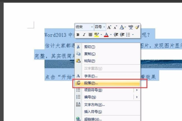 3、此时我们可以按住鼠标左键选中文字和未显示完整的图片,然后点击鼠标右键,在弹出的快捷菜单中选择“段落”。
