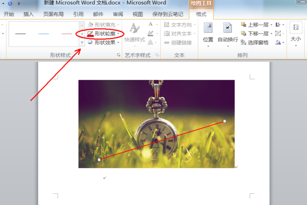 3、在WORD图片上,点击鼠标不放,拖动鼠标即可在图片上直接画出直线,另外按住Shift键再画线可画出水平或垂直的直线,也可根据需要点击上面“形状轮廓”,设置直线的颜色粗细等样式。