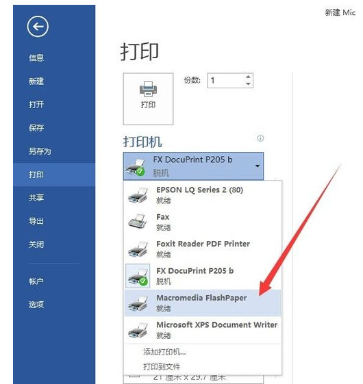 第四步:在弹出的打印设置选项窗口中,打印机选择Macromedia FlashPaper,设置完成后,点击打印按钮。