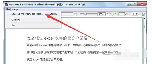 第六步:依次点击“file\save asMacromedia FlashPaper”菜单,在弹出窗口中指定一个保存flash文档的文件夹及flash文件名,这样就可以把打开的word文档转换成flash文件了。