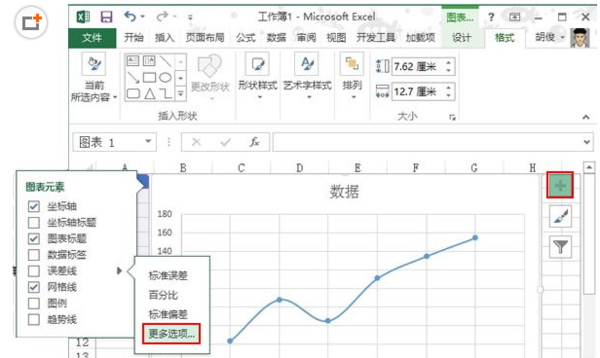 ①单击图表,然后鼠标左键单击+号,点击误差线后面的箭头,选择更多选项。