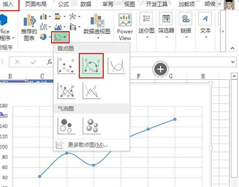 选中A1:B7区域,然后单击菜单栏--插入--散点图,选择第二种,带平滑线和数据标记的散点图。