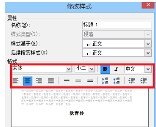 4、在“修改样式”中,点击向下的小箭头,设置一级标题的字体大小,是否加粗,是否居中,行距等等。以此类推,设置出二级标题,三级标题四级标题的字体样式;