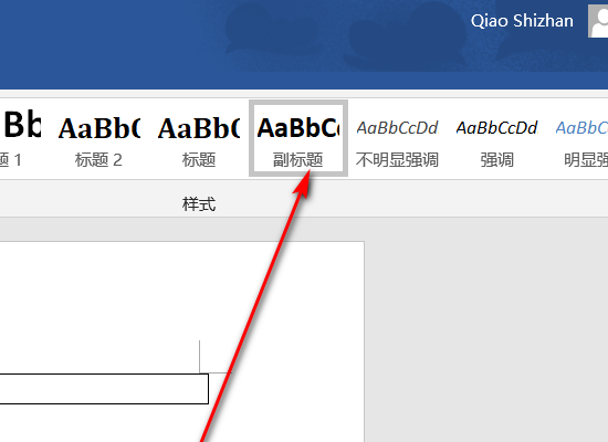 4、在word文档界面上方的“开始”选项卡下的菜单中选择“副标题”样式,即可。