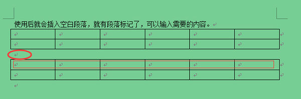 这个表格上面需要插入内容,但没有段落标记,无法下手。将光标放在第一行的任意单元格,按Ctrl+Shift+回车键 ,就可以插入一个空白段落(行)。
