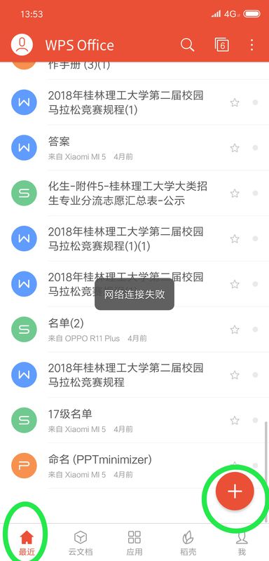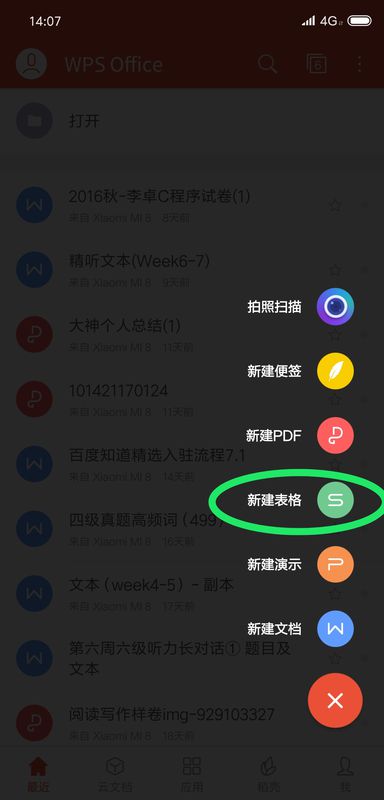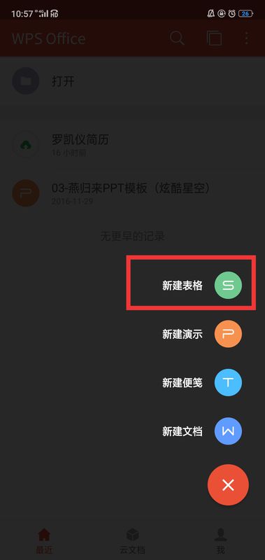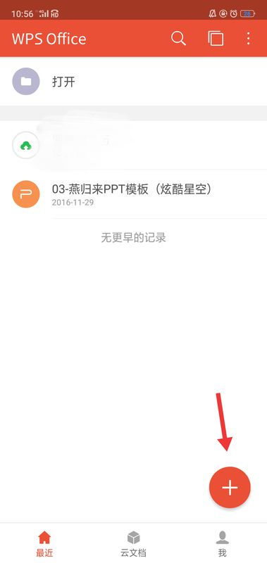 手机中WPS软件好用,一般手机都自带该软件,没有的话,可以下载一个,方便以后使用.一般出现的是最近查看的文档,点击下方第三个按钮,即“新建”按钮: