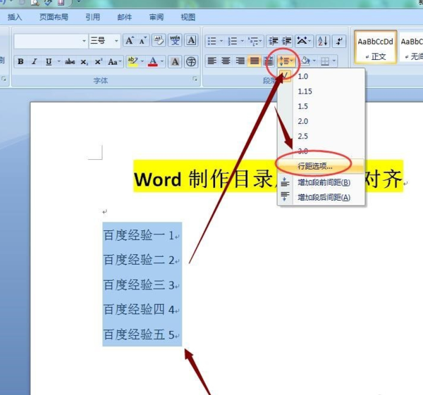 2、选中所有目录,点击菜单栏段落行距选项,如图