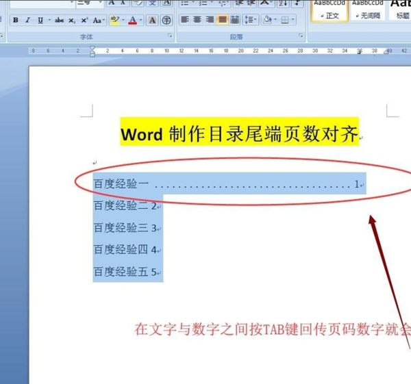 6、跟着我们继续利用快捷键TAB来完成下面的页数,在文字与数字之间按下TAB键回车,页数就会自动调整到字符36的位置上,所有行的尾端页数都对齐了。