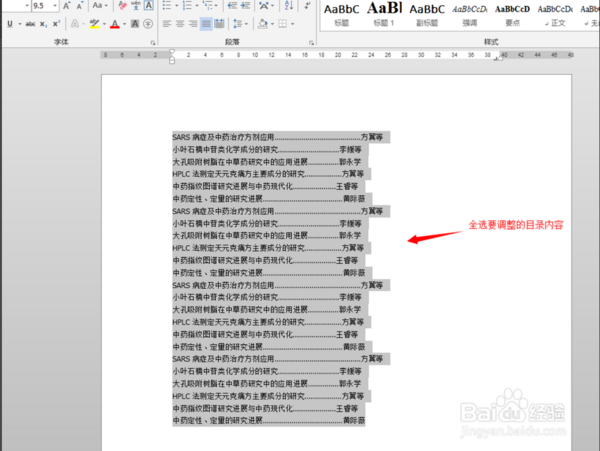 1、选中要调整的目录内容,可以用鼠标框选,也可以使用快捷键Ctrl+A 选中全部内容。