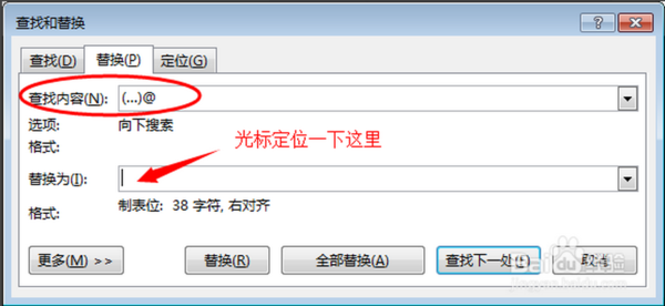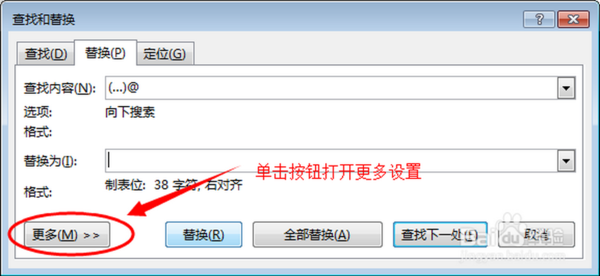 2、按快捷键Ctrl+H 打开对话框【查找和替换】,鼠标点击【查找内容】文本框,输入 (...)@ ,然后鼠标点击【替换为】文本框,再单击下面的【格式】按钮。如果没有显示格式按钮,可以点击 【更多】打开。