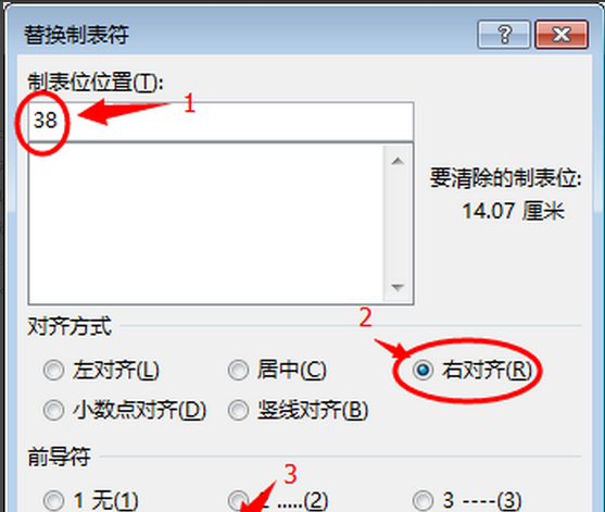 3、在【格式】下拉菜单中选择 制表位 选项,弹出替换制表符对话框,在【制表位位置】输入38(数值可以根据自己需要调整大小);【对齐方式】选择右对齐;【前导符】选择5【......】,然后单击设置按钮,并点击确定关闭对话框。
