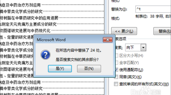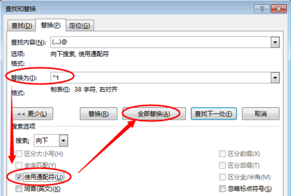 4、回到【查找和替换】窗口,在【替换为】文本框中输入 ^t ,单击下面【使用通配符】前的复选框打钩,最后单击 【全部替换】按钮。这时如果弹出对话框,询问是否替换其他位置,可以根据需要选择 是 或者 否。