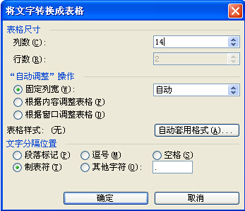 5、弹出将文字转换成表格对话框,在列数中输入14即可,如图所示。