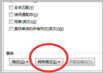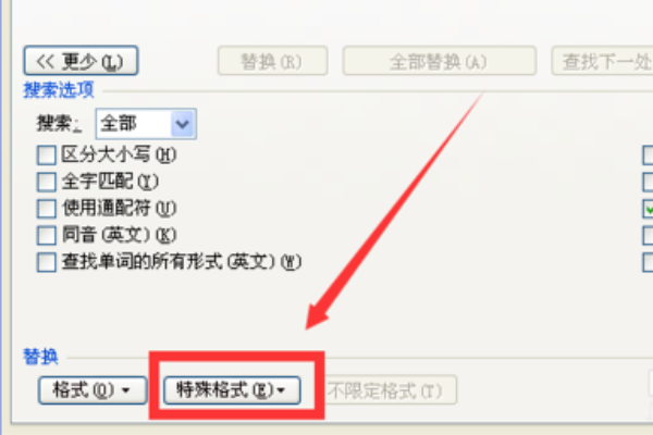 3、在“替换”选项卡下边有个“特殊格式”,我们单击。