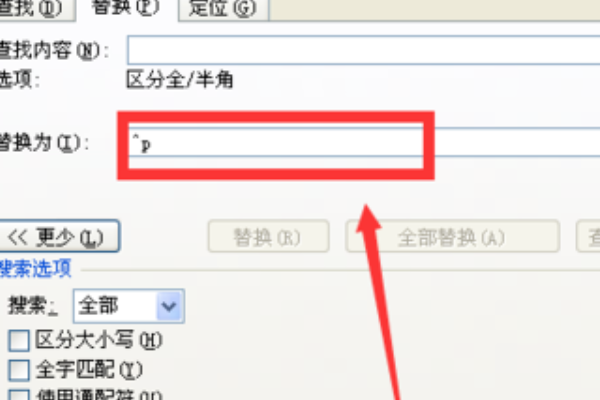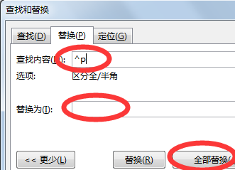 5、接着在查找内容里面就会出现如下字符,并在替换输入^p。