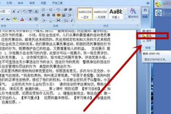 1、打开Word文档,在页面上方工具栏中点击“替换”选项。
