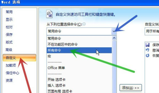 3、进入Word选项,点击自定义,然后在从下列位置选择命令中选择所有命令。