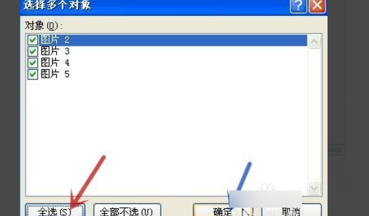 2、在“选择多个对象”对话框中,就会显示当前Word文件中的所有图片。点击左下角的“全选”,表示图片被全部选中,然后再点击右下角的“确定”即可。