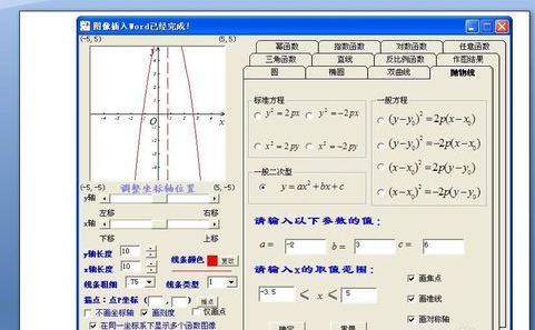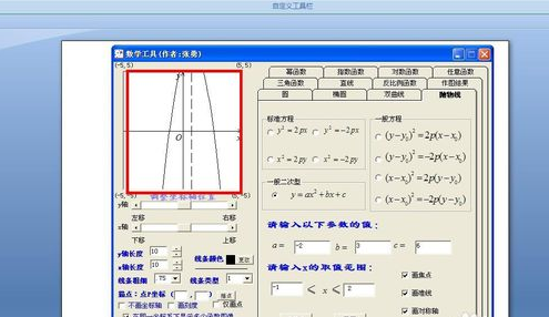 2. 单击“函数图像”按钮,弹出对话框,单击“抛物线”按钮,下面有标准方程和一般二次型方程,我们选择一种(这里选择一般二次型方程)。