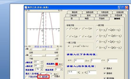 3.现在我们设置a=-2,b=3,c=6,x的取值范围定义为-3.5<=x<=5,在勾取画焦点、画对称轴、画准线,单击确定。