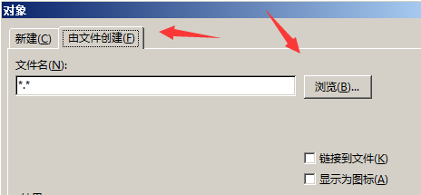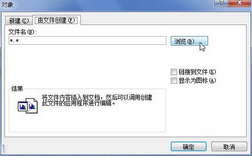第2步,在打开的“对象”对话框中切换到“由文件创建”选项卡,然后单击“浏览”按钮