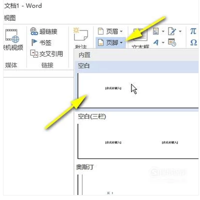 3.在插入的目录下找到页脚,点击后选择空白,如图所示。