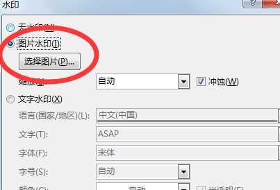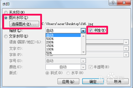 6、在弹出的水印对话框中可以看到需要设置的选项,如图所示: