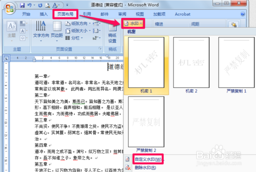 如果想自定义水印,就在页面布局中选择“水印-自定义水印”