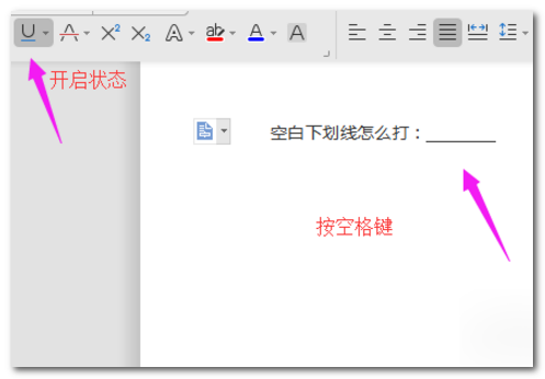 点击菜单栏中的U下面有一横的一个按钮(下划线按钮),变成为黄色的以后。点击空格键,要多长就按几次横线就变成你需要的长度即可。再点击(下划线按钮),停止划横线,进入正常状态。
