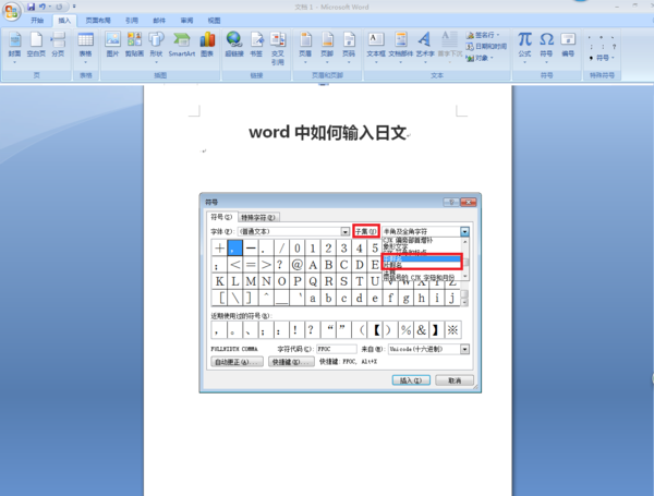 2.在“符号”对话框里,在“子集”里选择平假名、片假名;