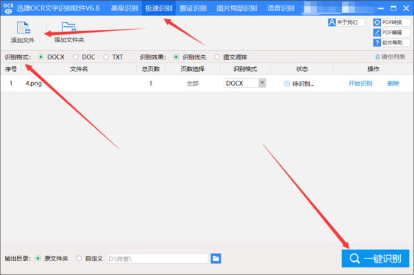 第一步:打开ocr工具,选择上面的‘极速识别’按钮。