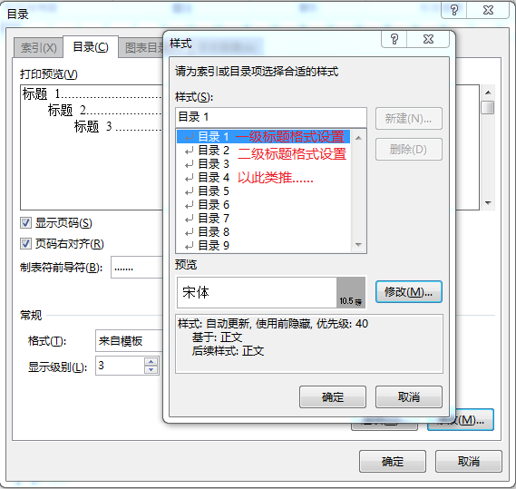 仿照步骤1、2设置二、三级标题格式为标题2、标题3。