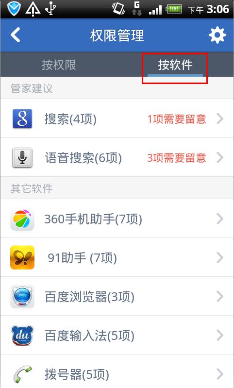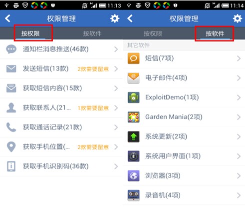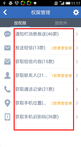 2、查看软件恶意行为。进入后即可按照【权限】或【软件】两种方式查看到各软件是否存在安全隐患,如图: