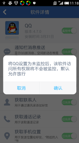 同样,也可以按照【通话记录】、【手机位置】、【短信】等分类查看相应正在使用该权限的软件,并进行处理: