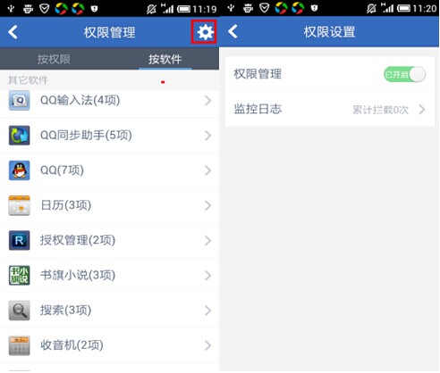 最后,在权限管理的右上角,点击小齿轮,即可开启/关闭权限管理的总开关,并查看监控日志: