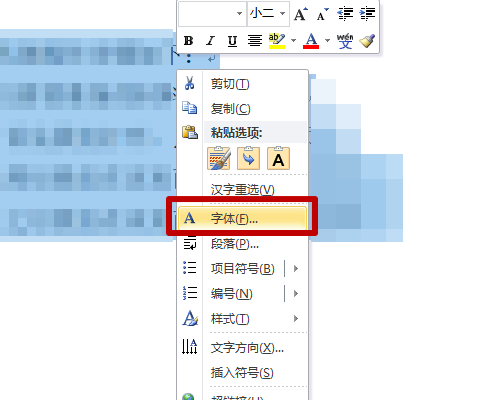 1、首先我们打开需要编辑的Word,选中字体鼠标右键单击选择“字体”选项。