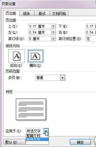 2、在“页面设置”对话框,切换至“页边距”选项卡,单击“横向”,并在“应用于”框中,单击“所选文字”(如图2),单击“确定”按钮。现在,在Word文档中,表格所在的页面就被设置为横向了,而表格之前之后的内容仍然是纵向的页面。