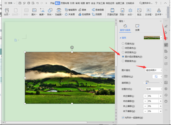 2、接下来,选择页面右侧的“属性”,选择“图片或纹理填充”,然后选择所需的图片。