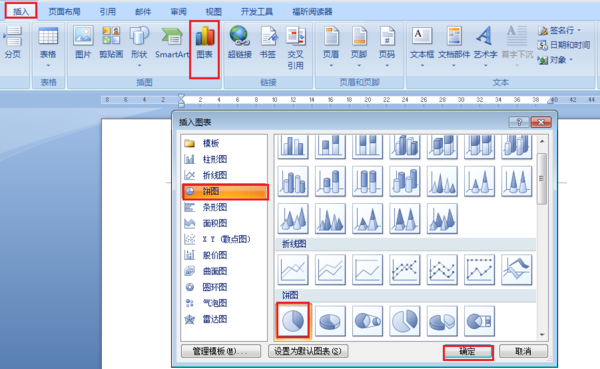 1、依次点击“插入”、“图表”,“饼图”,“确定”。