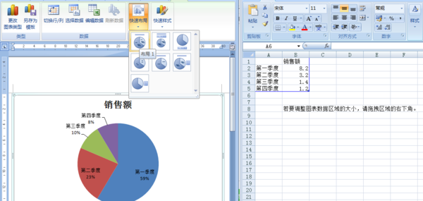 2、 在激活的excel中输入图表数据,word图表直观的加以反映。然后点击“快速布局”选择图表分析样式。比如选择第一种,效果见下图左边。