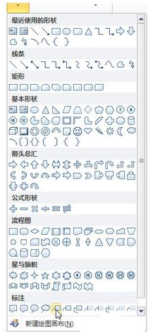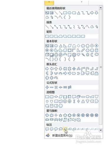 2、选择形状工具,在下拉列表中选择新建绘图画布工具;