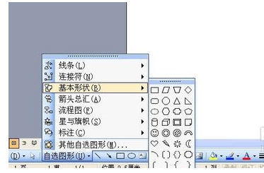 2,接着就单击“自选图形”会弹出菜单,把鼠标放在“自选图形”与菜单之间的“省略号”处会浮现“拖动可使此菜单浮动”的字样,按住鼠标左键拖到下方即可分离出来。分离出来之后把它拖到工具栏上面去,如图示4所示。