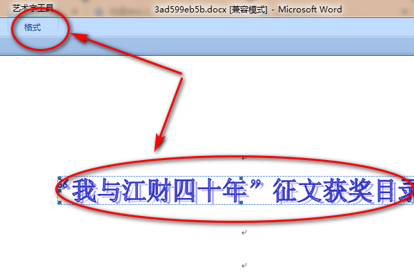 2、当字体更改为所选的艺术字样式时,点击“格式”页面选项。