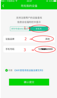 3、填写手机品牌及手机号码(设备MAC、设备序列号其中一项)确认提交,寻找结果出来后点击查看。