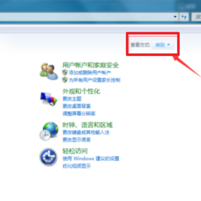 2、然后在控制面板页面中,点击右上方的“查看方式”下拉倒三角设置为类别。
