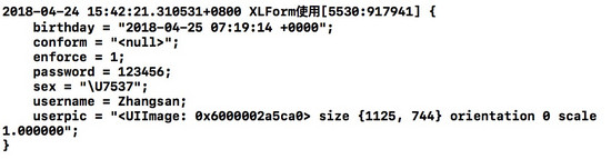 5.如何获取设置好的表单的值?其实非常简单,该框架提供一个方法formValues,它的返回类型是一个NSDictionary,其中key就是XLFormRowDescriptor设置时的Tag。可以直接在控制器中调用该方法获取表单值,上面的效果图设置后的表单信息如下: