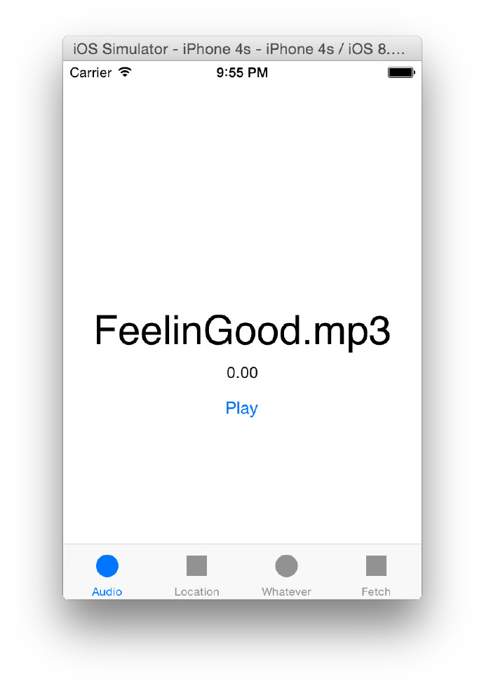 测试后台模式是否起作用.按home按钮(如果你正在使用模拟器,按Cmd-Shift-H).如果你在真正的设备上运行(不是Xcode 6.1的模拟器)音乐将停止.这是为什么呢?还有很重要的一块落下了!)