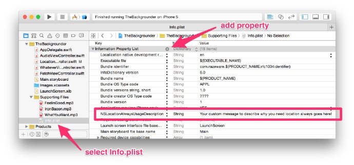 提示:为了使后台模式充分发挥作用,你应该使用一个真正的设备.根据我的经验,如果你忘记配置设置,该APP在模拟器的后台能很好的运行运行.然而,当你切换到真正的设备时,它将不会运行.