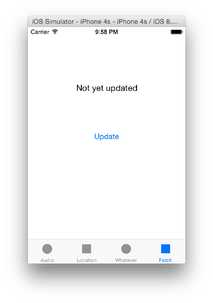用这个方案运行你的APP.你会发现,该APP没有真正的打开,而是直接运行到了挂起状态.现在,手动开启它,并进入Fetch选项.你会看到,当你运行该APP时,时间会更新,而不会显示“Not yet updated”.
