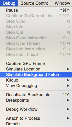 测试后台获取的一个方法是停下来等着系统决定去执行它.这需要大量的等待.幸运的是,Xcode体统了模拟后台获取的方法.有两种你需要测试的情况,一种是当你的APP在后台中时,另一种是你的APP处于从被挂起到继续运行的情况.第一种方法最简单,仅仅是一个选择菜单.